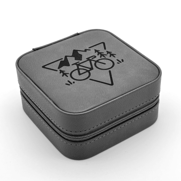 Vegan leather jewelry box to hold your rings, necklaces, bracelets, and earrings. Zipper closure to secure your items for safe keeping. Perfect for travel or a small collection as it packs easily but protects the contents. BikeTri design is laser engraved for long-term durability and won’t fade with regular use. Interior is flocked with a soft touch which is gentle on your jewelry. Keep items separated by three hooks and chain pouch on the top. Quad compartment and ring holders complete the box.The quad compartment divider is removable to accommodate larger earrings. Note that the ring portion is fixed but can be used for earrings or to tuck in small pendants.