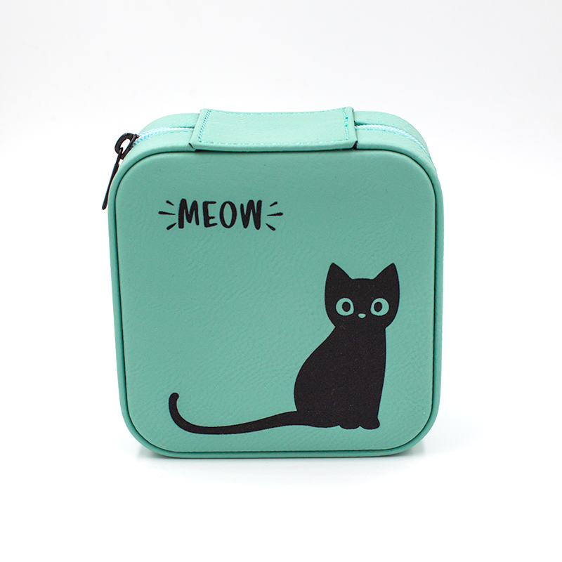 Vegan leather jewelry box to hold your rings, necklaces, bracelets, and earrings. Zipper closure to secure your items for safe keeping. Perfect for travel or a small collection as it packs easily but protects the contents. Cat Meow design is laser engraved for long-term durability and won’t fade with regular use. Interior is flocked with a soft touch which is gentle on your jewelry. Keep items separated by three hooks and chain pouch on the top. Quad compartment and ring holders complete the box.The quad compartment divider is removable to accommodate larger earrings. Note that the ring portion is fixed but can be used for earrings or to tuck in small pendants.