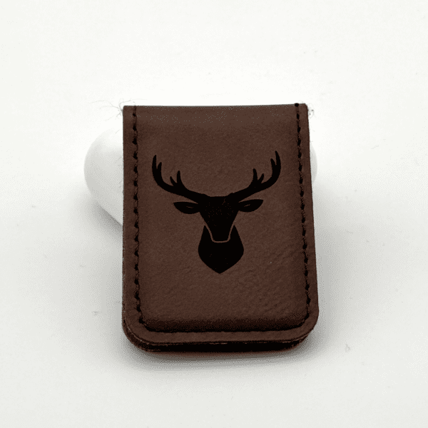 A simple magnetic-closure money clip designed to keep your cash secure. Made from vegan leather and faux suede. Laser engraved Deer design add your personality to an item you’ll use every day. Not recommended for use with cards. Wipe clean with a soft damp cloth. Do not submerge.