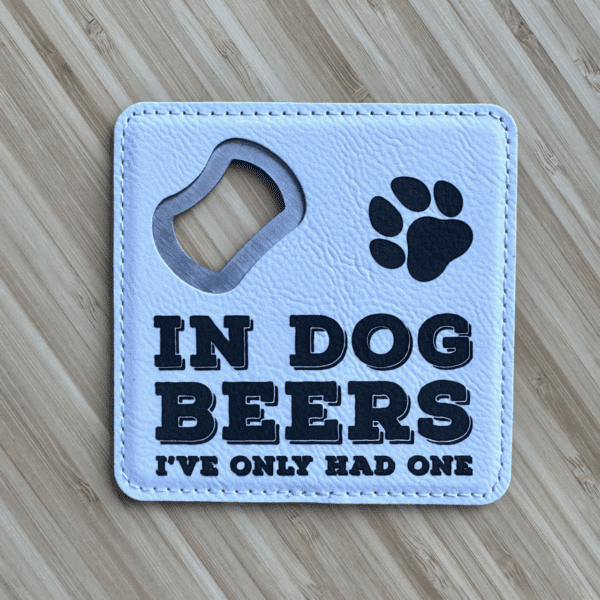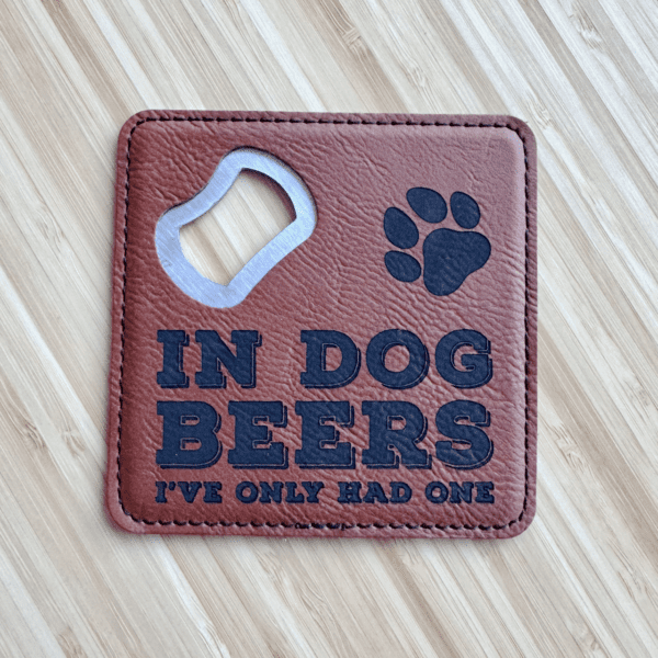 Heavyweight vegan leather coaster with a faux suede back to protect surfaces and sturdy with a stainless steel core. Integrated bottle opener so you’ll never have to search to open your favorite beverage. Lays flat to stack. Only 1 in Dog Beers design is laser engraved for long-term durability and won’t fade with regular use.