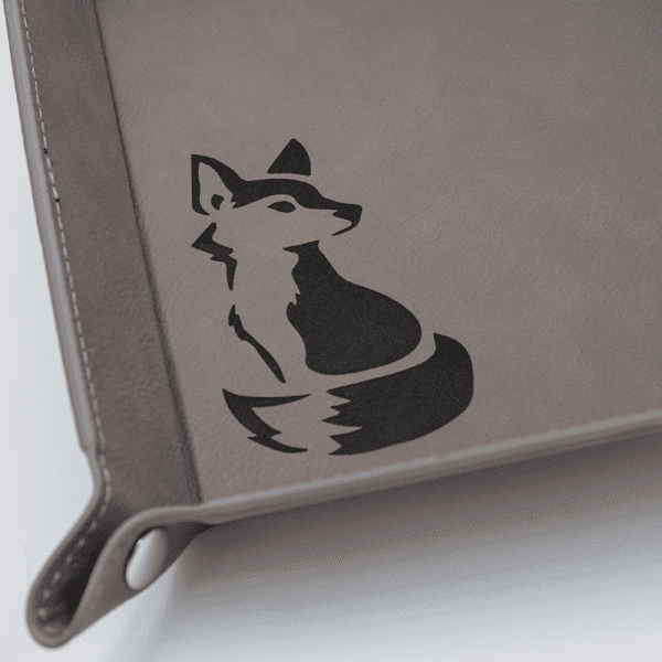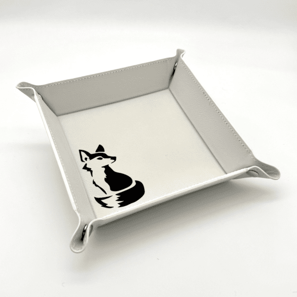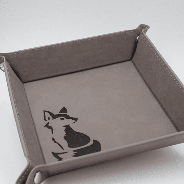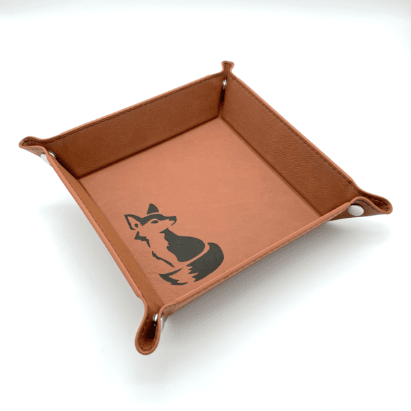 Vegan leather tray to hold your keys, phone, or other small electronics items. Metal Snap corner closures that allow the tray to fold flat to fit in a drawer when not in use. Fox design is laser engraved for long-term durability and won’t fade with regular use.