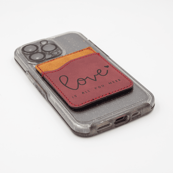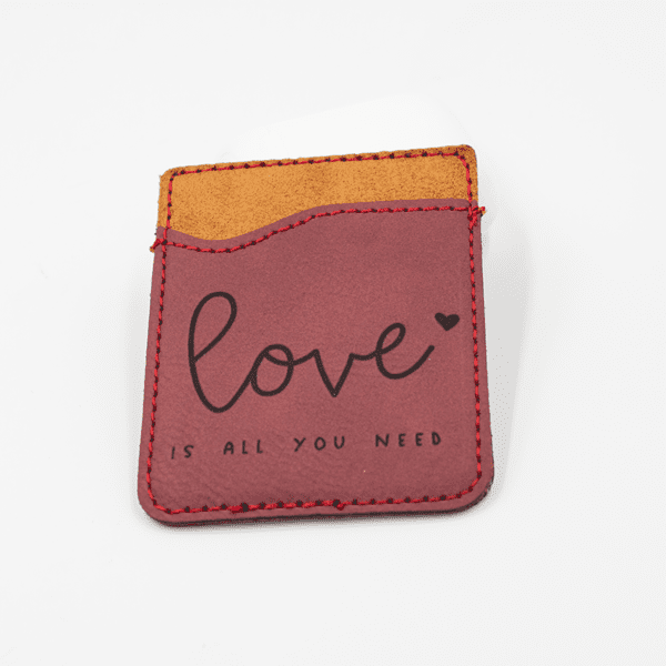 A soft, single pocket wallet made from vegan leather and faux suede. Low profile with 3M removable adhesive to attach the wallet to your phone. Subtle laser engraved Love design. Holds 1-2 cards such as an ID. Just what you need with you and nothing else.