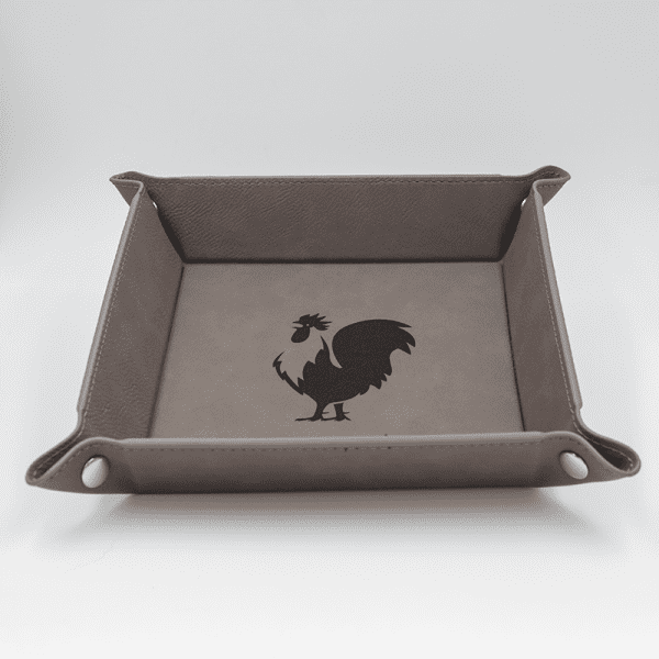 Vegan leather tray to hold your keys, phone, or other small electronics items. Metal Snap corner closures that allow the tray to fold flat to fit in a drawer when not in use. Rooster design is laser engraved for long-term durability and won’t fade with regular use.