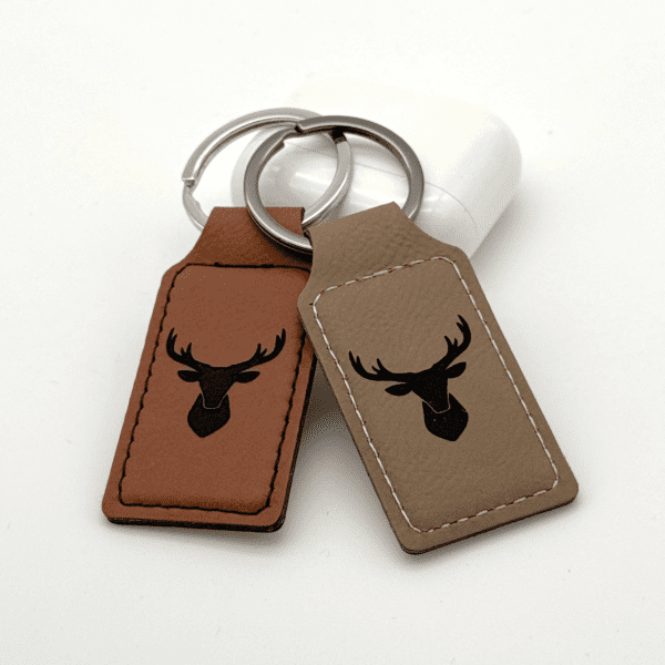 Vegan leather keychain with stitching detail and sturdy ring for attaching to keys or a bag. Deer design is laser engraved for long-term durability and won’t fade with regular use.